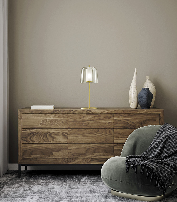 Lampada da tavolo in oro spazzolato. Vetro trasparente beige chiaro. Cavo dotato di dimmer.
